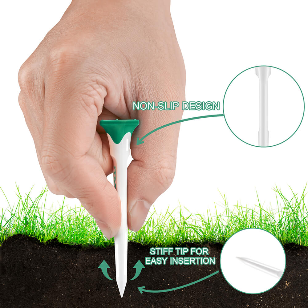 This golf tee with a non-skid design in the middle part,plus a stiff & sharpened tip,make it more easy insertion into the ground.